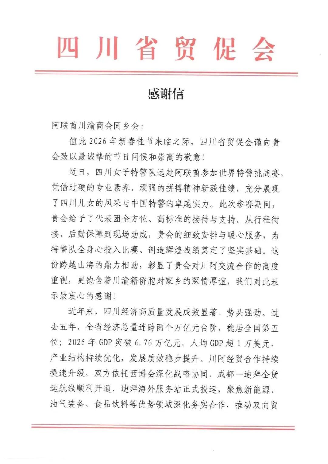 近日,四川女子特警队远赴阿联酋参加世界特警挑战赛,凭借过硬的专业素养、顽强的拼搏精神斩获佳绩,充分展现了四川儿女的风采与中国特警的卓越实力。此次参赛期间,贵会给予了代表团全方位、高标准的接待与支持。从行程衔接、后勤保障到现场助威,贵会的细致安排与暖心服务,为特警队全身心投入比赛,创造辉煌战绩奠定了坚实基础。这份跨越山海的鼎力相助,彰显了贵会对川阿交流合作的高度重视,更饱含着川渝籍侨胞对家乡的深情厚谊,我们对此表示最衷心的感谢!