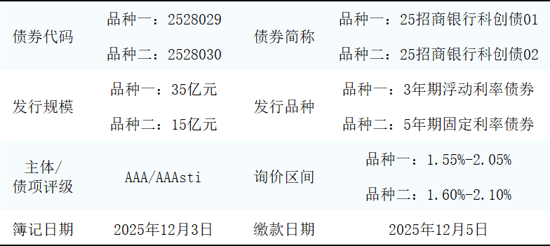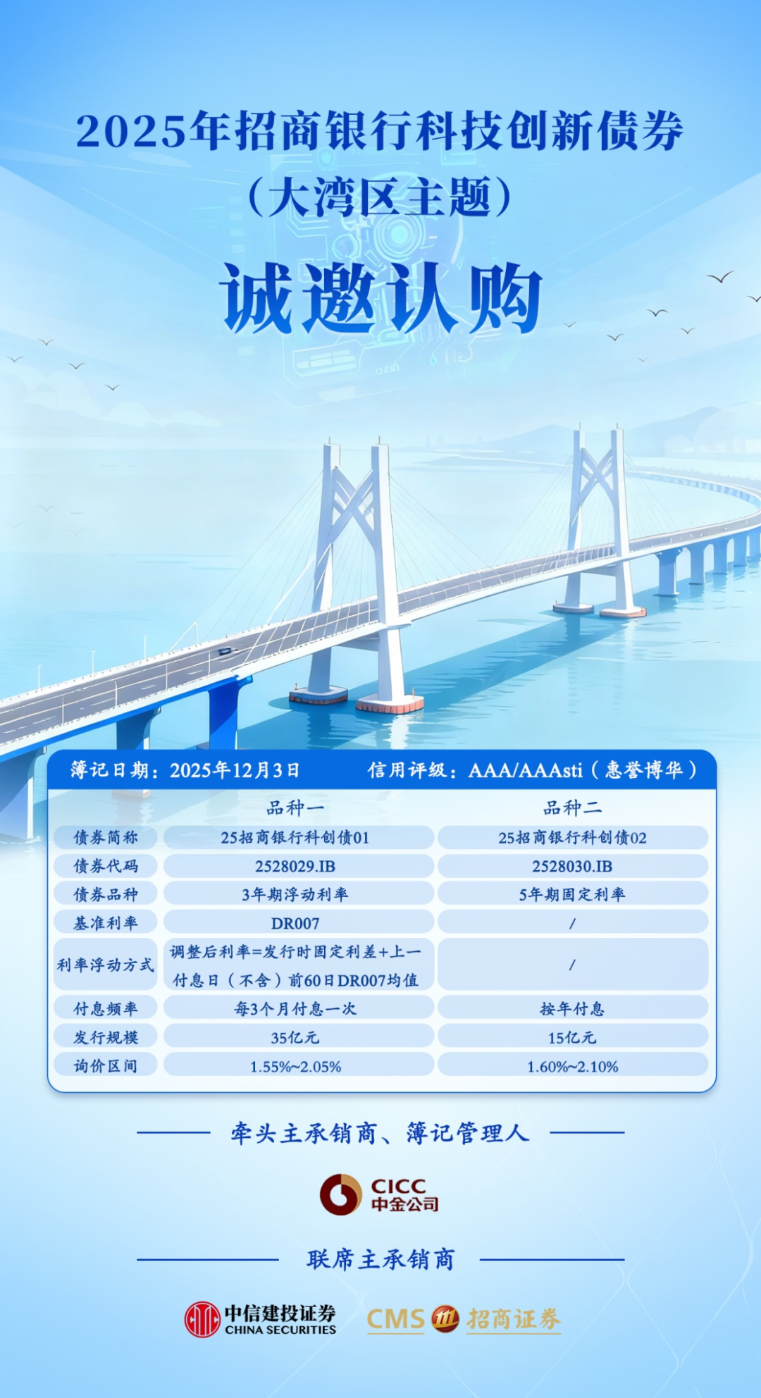 2025年12月3日,招商银行股份有限公司(以下简称“招商银行”或“发行人”)将在全国银行间债券市场发行2025年第一期科技创新债券(债券通)。本期债券分为两个品种:品种一为3年期浮动利率债券,发行规模35亿元;品种二为5年期固定利率债券,发行规模15亿元。本期债券发行规模合计人民币50亿元,主体评级为AAA,债项评级为AAAsti。本期债券募集资金将依据适用法律和主管部门的批准,通过贷款、债券等多种途径,专项支持科技创新领域业务,重点支持粤港澳大湾区高质量发展。
