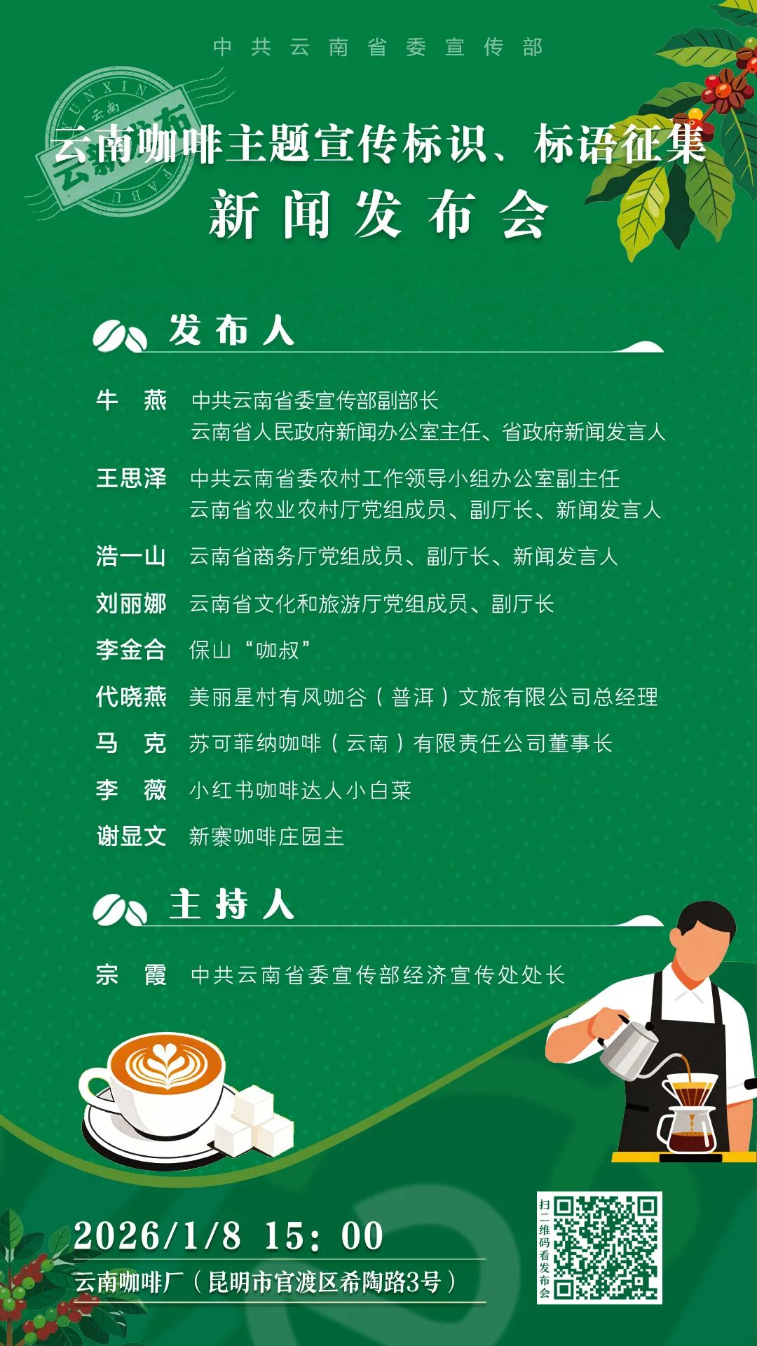 1月8日下午,中共云南省委宣传部联合云南省商务厅、云南省农业农村厅举行云南咖啡主题宣传标识、标语征集新闻发布会,介绍相关情况并回答相关提问。