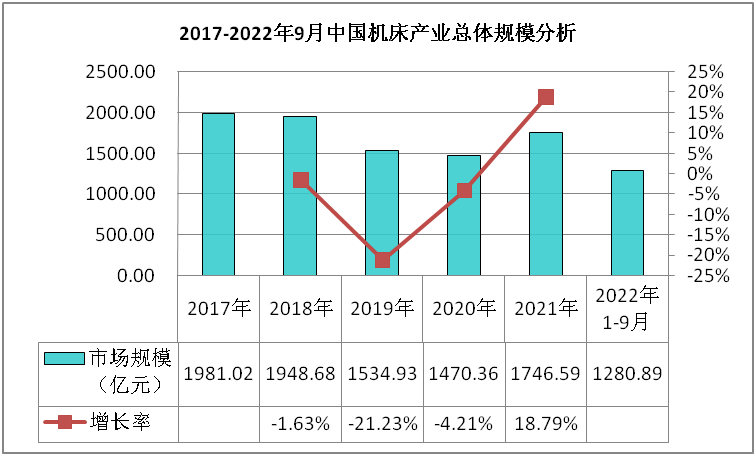 得益于我国新冠疫情防控和经济发展的良好局面,2021年我国机床行业延续了2020年下半年以来的回稳向好趋势,2021年我国机床行业总体市场规模达1746.59亿元。