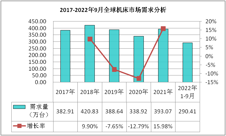 从全球机床需求市场来看,全球机床行业市场需求由2017年的382.91万台增长至2021年的393.07万台,其中中国、美国和德国三个国家占据全球机床需求一半以上的市场份额。