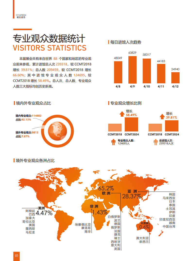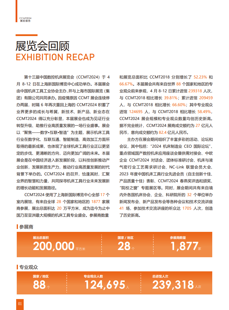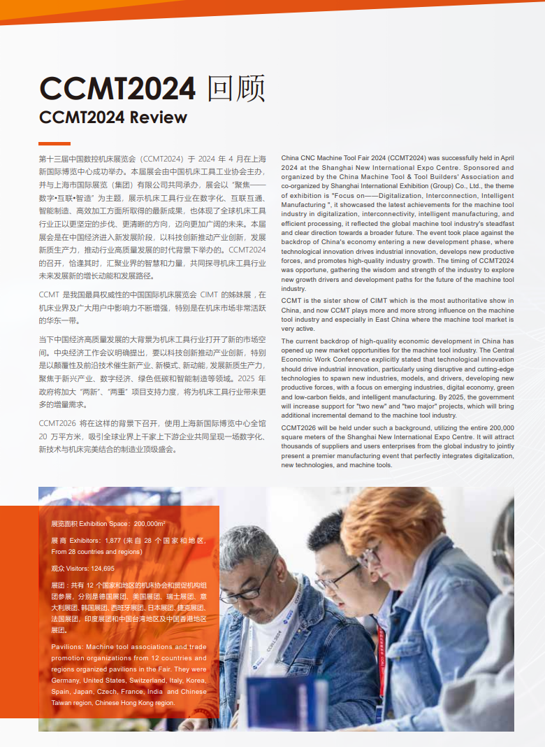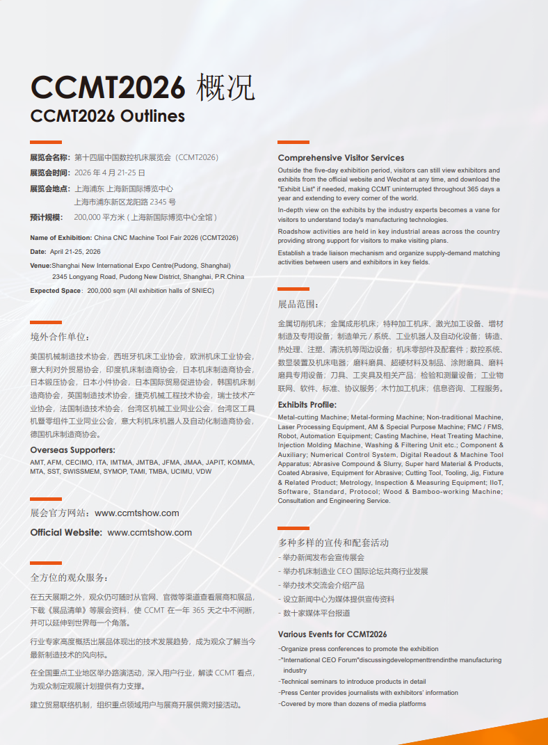 推介理由:展会由权威机构中国机床工具工业协会举办,该展是CIMT展会姐妹展,展会规模达20万平方米,上届展会超过12万名观众参观。中国数控机床展览会(CCMT)于2000年在上海创办,至今已连续成功举办了十一届。在2020年和2022年两届展会因新冠疫情停办,时隔六年后,第十三届中国数控机床展览会(CCMT2024)于2024年4月举办,受到了境内外机床工具界、产业链上下游制造厂商及用户领域的高度关注。CCMT2024展会首次使用上海新国际博览中心全部17个室内展馆,展会总面积达20万平方米,比CCMT2018增长66.67%;共有来自28个国家和地区的1877家展商参展,比CCMT2018增长52.23%,其中德国、日本、瑞士、美国、西班牙、韩国、意大利、法国、捷克、印度、中国台湾地区和中国香港地区等12个国家和地区的机床工具行业协会和贸促机构组织展团参展;共有来自88个国家和地区的124695名专业观众到会参观采购,比CCMT2018增长58.49%。CCMT2024 展会总面积、参展商数量和专业观众数量均创历史新高。于2000年在上海创办,至今已连续成功举办了十一届。在2020年和2022年两届展会因新冠疫情停办,时隔六年后,第十三届中国数控机床展览会(CCMT2024)于2024年4月举办,受到了境内外机床工具界、产业链上下游制造厂商及用户领域的高度关注。CCMT2024展会首次使用上海新国际博览中心全部17个室内展馆,展会总面积达20万平方米,比CCMT2018增长66.67%;共有来自28个国家和地区的1877家展商参展,比CCMT2018增长52.23%,其中德国、日本、瑞士、美国、西班牙、韩国、意大利、法国、捷克、印度、中国台湾地区和中国香港地区等12个国家和地区的机床工具行业协会和贸促机构组织展团参展;共有来自88个国家和地区的124695名专业观众到会参观采购,比CCMT2018增长58.49%。CCMT2024 展会总面积、参展商数量和专业观众数量均创历史新高。展览会时间:2026年4月21-25日