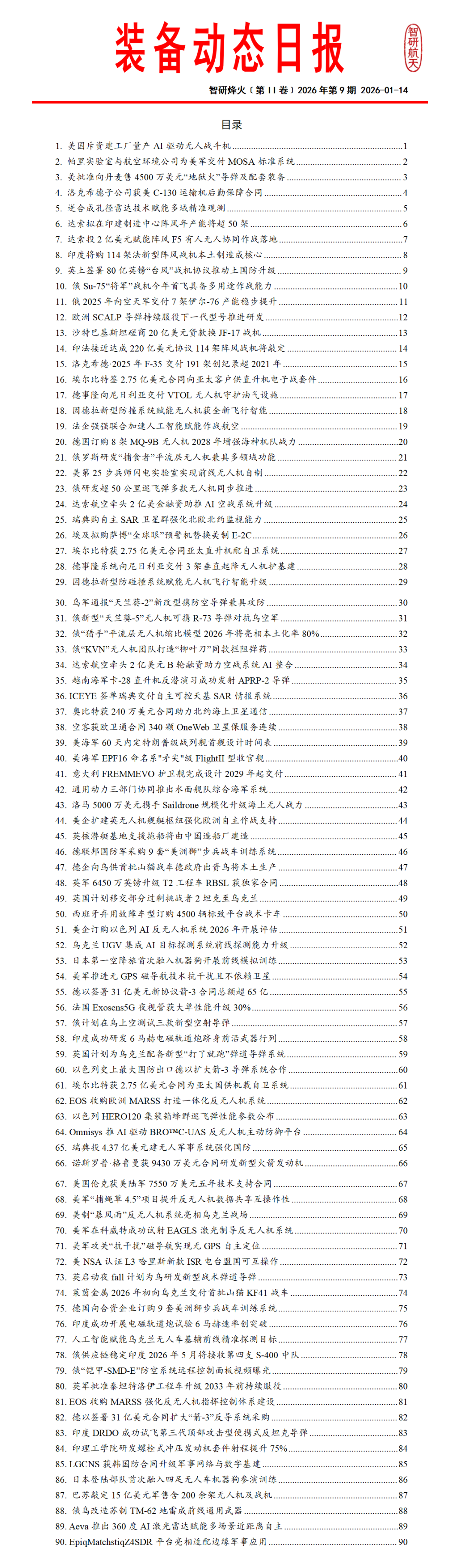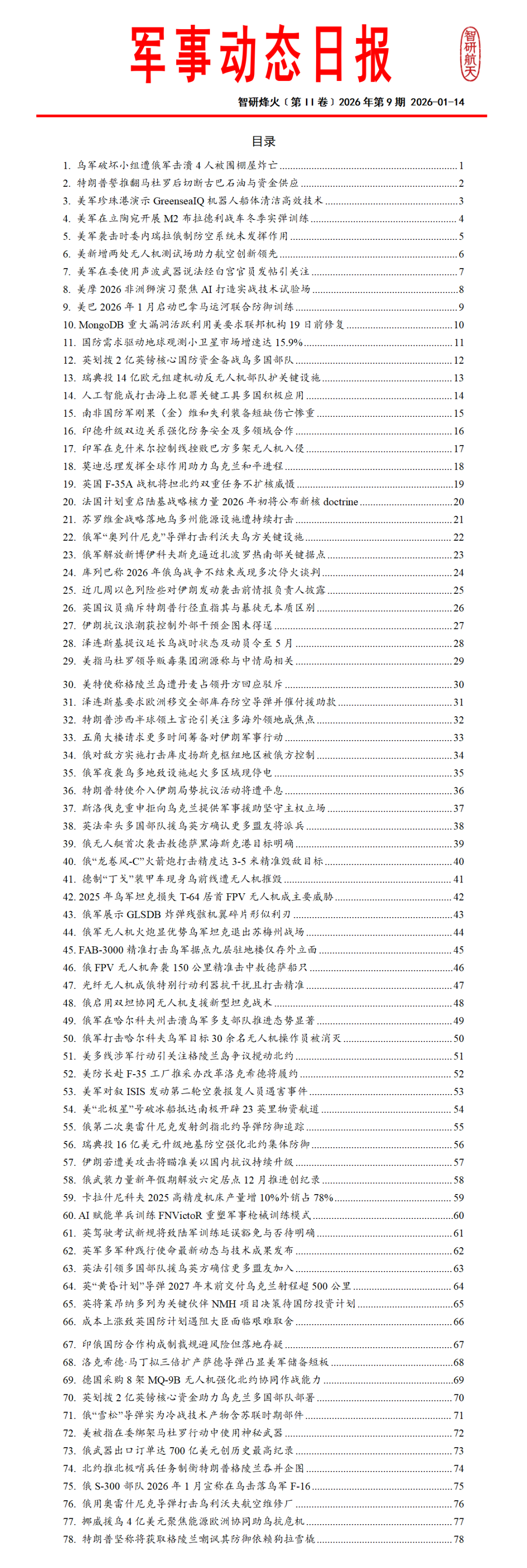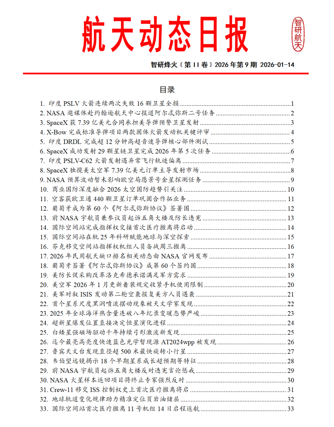 《全球防务动态》系列专刊国内独家每日发布涵盖航天领域、武器装备、军事热点、人工智能、先进制造等领域的全球动态信息。提供“航天动态专报”、“装备动态专报”、“军事动态专报”、“智造动态专报”以及“航天防务新闻日报”等特色产品模块。工作日每日推送,形成结构化、可编辑的文档,供订阅用户在小程序“智研烽火信息”商城下载。每日及时的动态信息能够有力支持各单位进行要讯报送、军情研究与安全形势分析的需求。