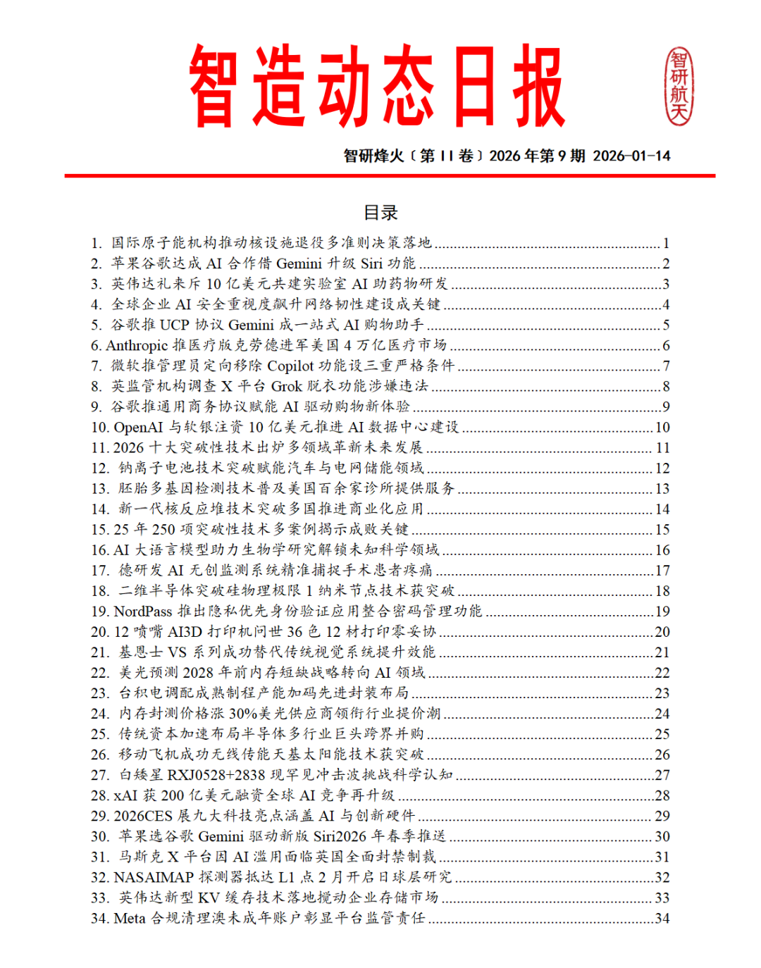 聚焦全球智能制造领域的权威情报产品,每日精选航空技术与应用、人工智能、工业机器人、增材制造、芯片工艺等核心技术突破与产业动态,以结构化、可编辑的文档形式呈现。内容涵盖技术解析、企业战略及政策影响,依托资深专家团队及强大的开源情报处理能力,助力企业快速捕捉技术趋势与市场机遇,把握智造脉搏,引领产业升级。