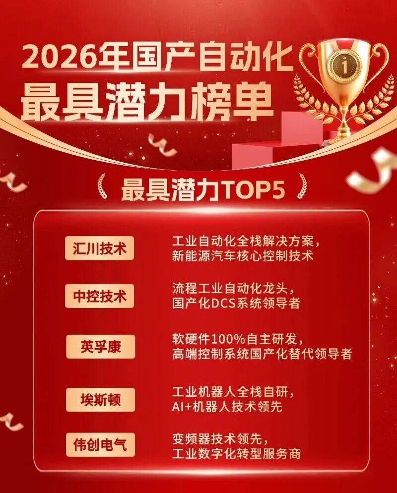 基于技术壁垒、市场增长、政策支持与行业影响力四大维度综合评估,以下为2026年工业自动化领域最具潜力的TOP5企业。