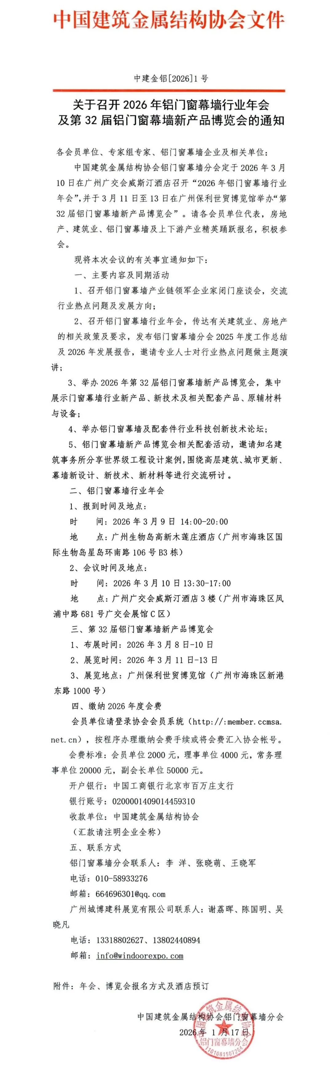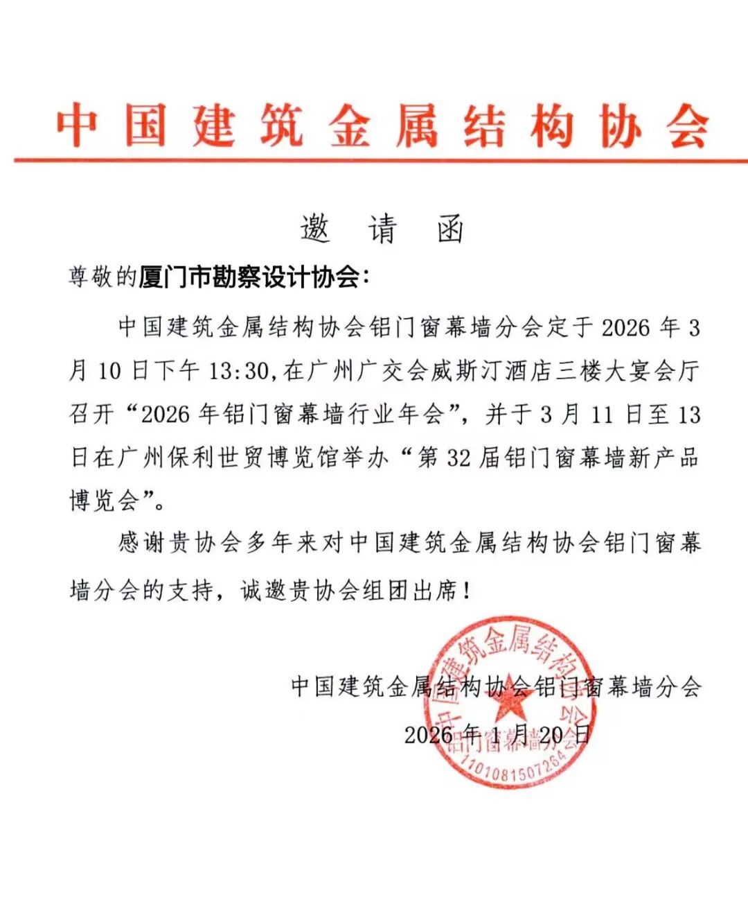 中国建筑金属结构协会铝门窗幕墙分会定于2026年3月10日在广州广交会威斯汀酒店召开2026年铝门窗幕墙行业年会,并于3月11日至13日在广州保利世贸博览馆举办第32届铝门窗幕墙新产品博览会。