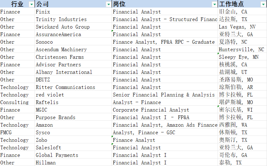 US地区最新岗位汇总表: