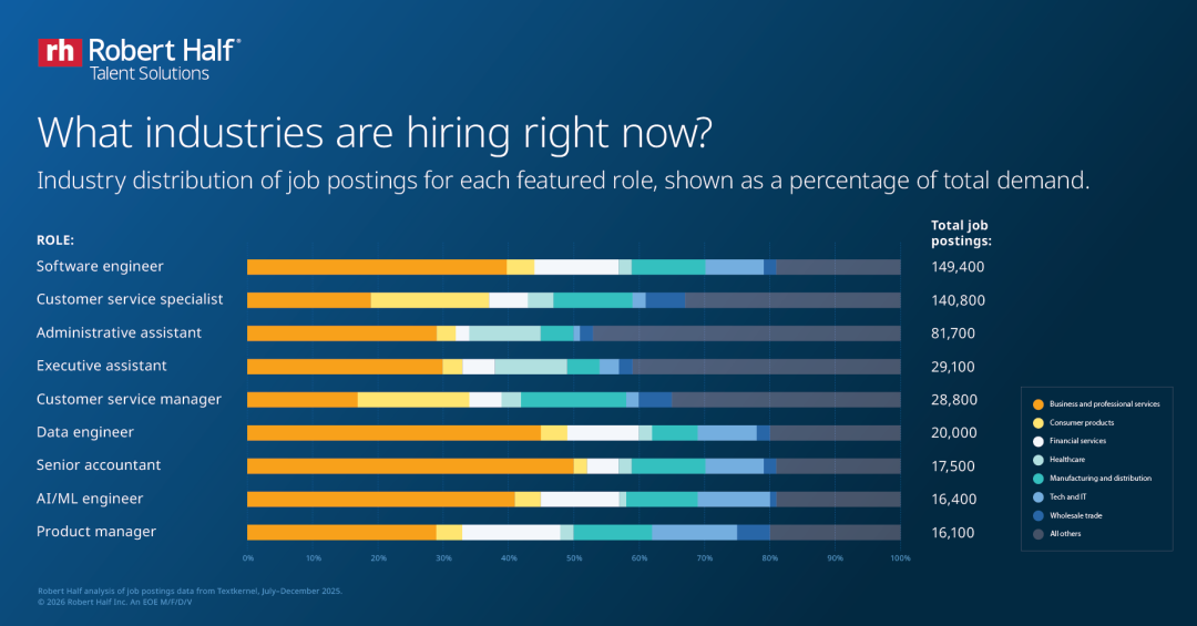 Robert Half最新发布了一份招聘趋势报告,数据来自2025下半年全美数百万条岗位信息。报告显示:市场还在招人,但风向变了。招聘最多的五个行业,新增了超过100万的岗位。对正在求职的留学生来说,看懂这些变化,比盲目投简历更重要。