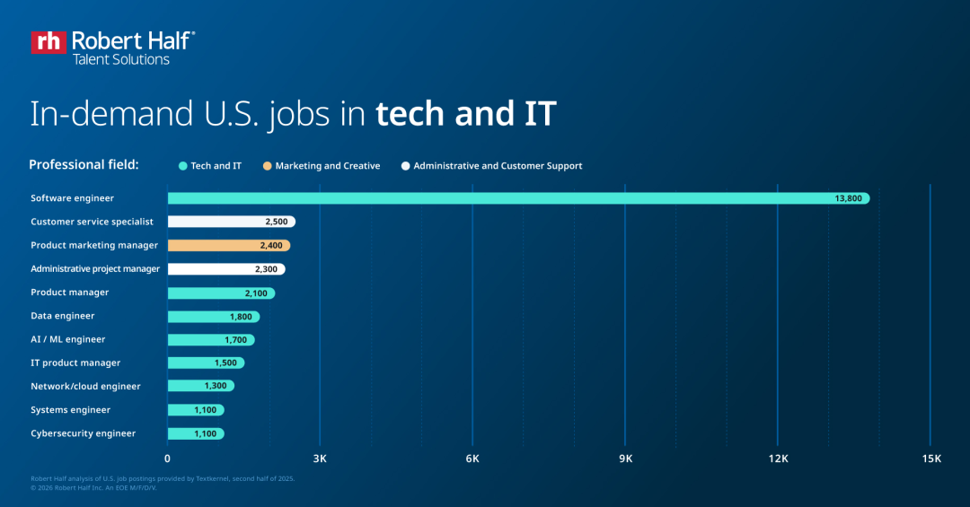 经历了几年主要科技公司裁员的低迷后,2025年下半年的科技行业相对稳定,较2024年同期有所下降。科技行业的公司,主要招聘技术岗位和市场营销和创意岗位: