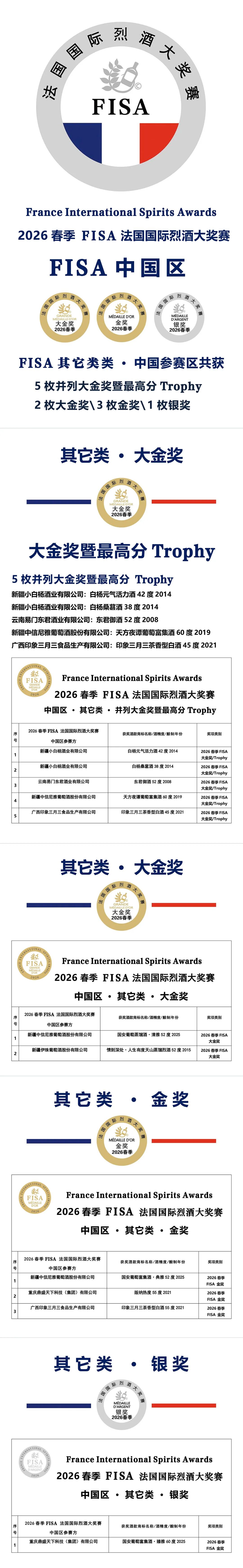大金奖、金奖及银奖