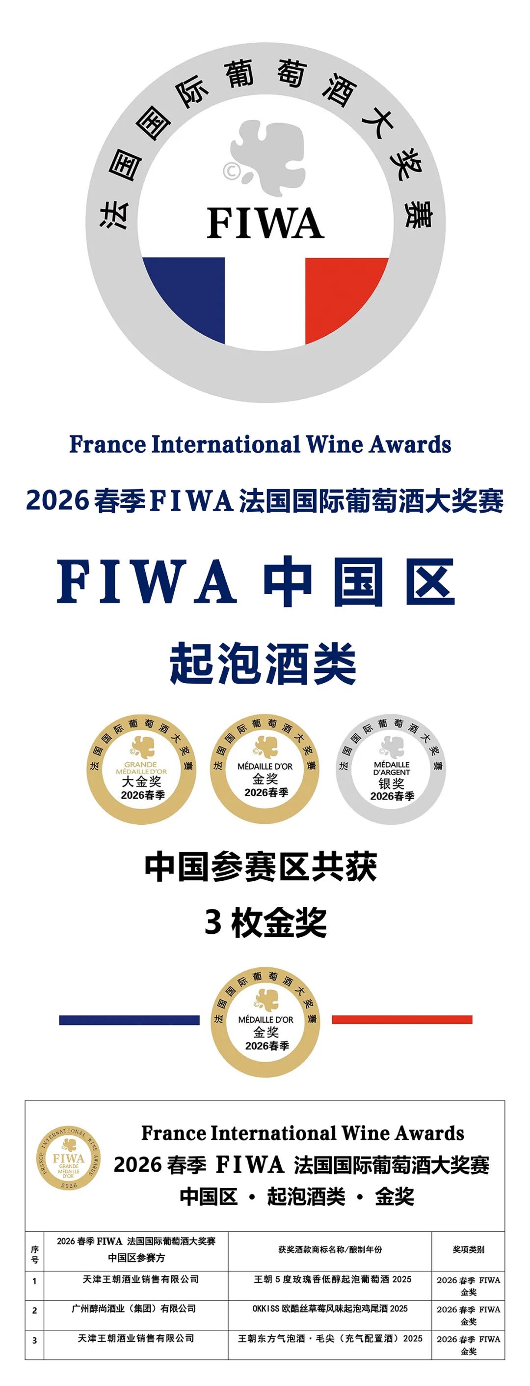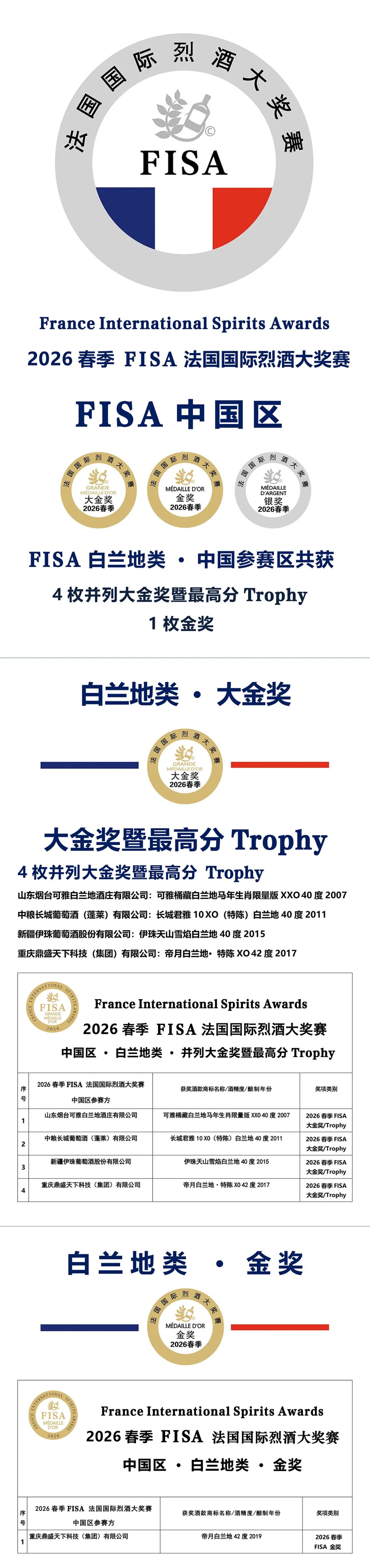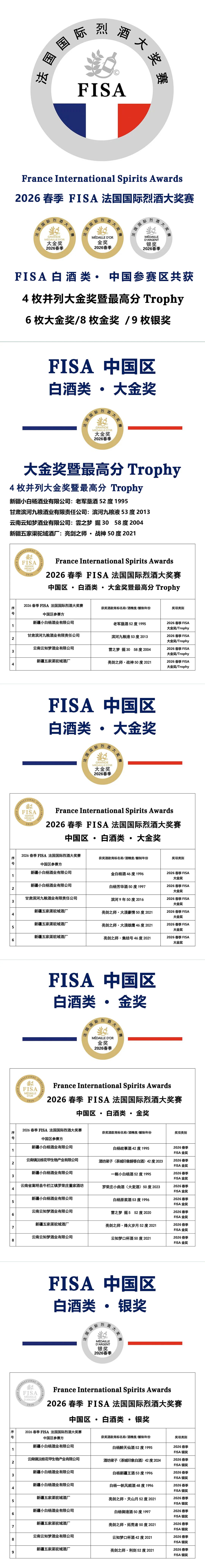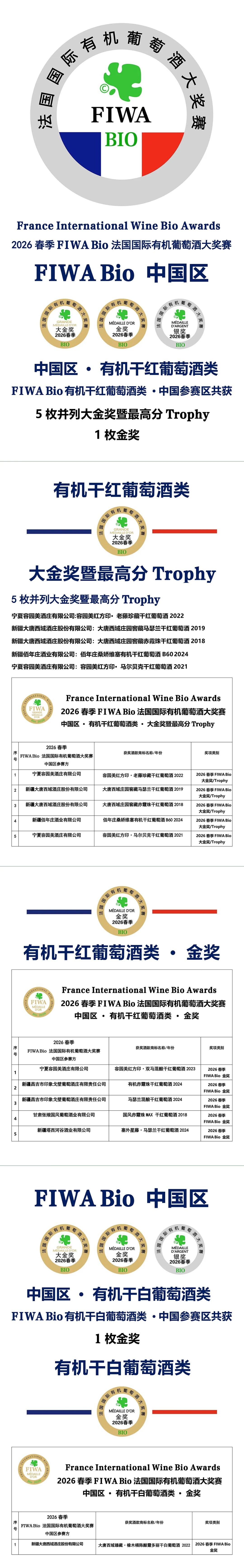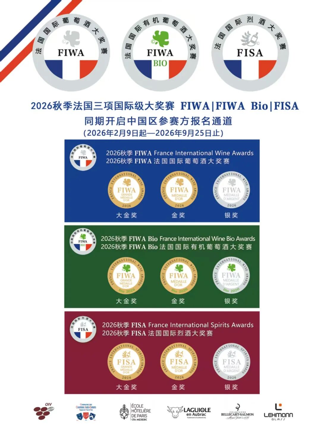 目前,全球有300多个形形色色的国际性酒类大奖赛,但真正达到严谨公正,真正依据国际化标准并受国家官方审核审批和监督的国际性大奖赛屈指可数。FIWA、 FIWA Bio & FISA 法国国际葡萄酒、法国国际有机葡萄酒及法国国际烈酒三项大奖赛,就是法国唯一拥有国字头并面向全球的酒庄及酒商开放的,全程由法国国家海关总署 DGCCRF 监审,严格遵守“OIV 国际葡萄及葡萄酒组织”的百分制标准,由专家评委进行100%盲品并只设立大金奖(其中最高分为Trophy)、金奖和银奖三个奖项的国际级大奖赛,获奖率仅为33%