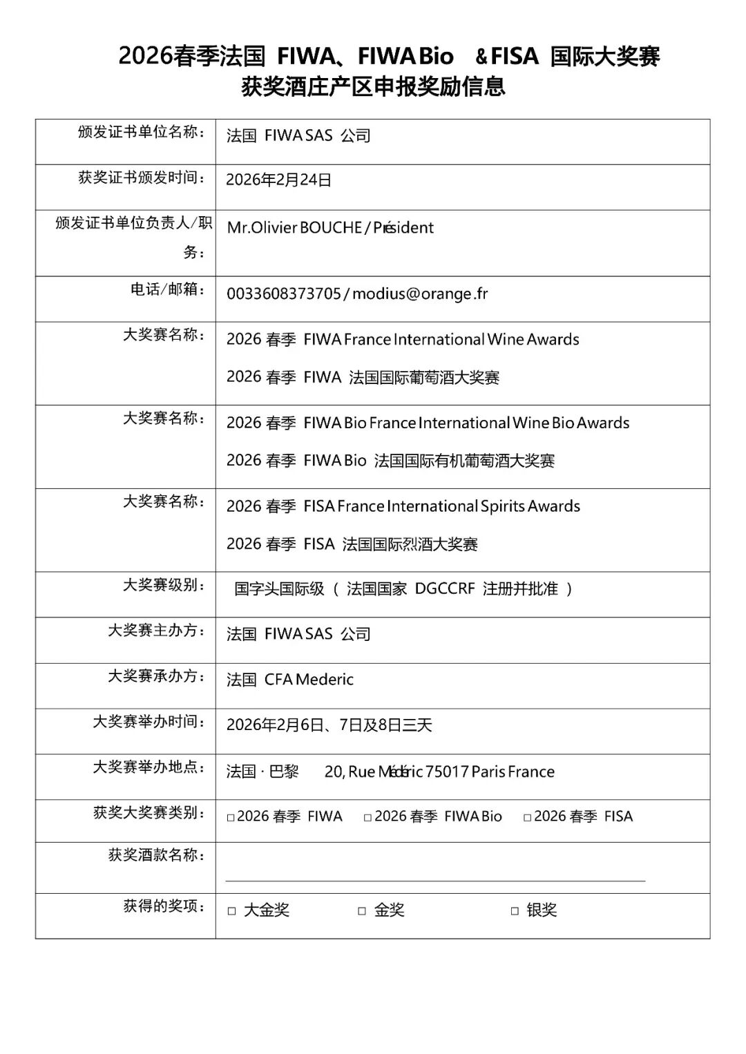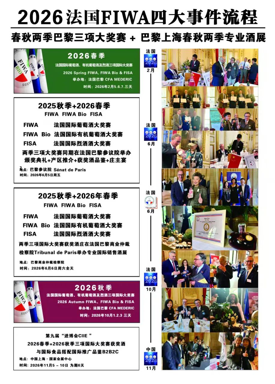 活动细节及获奖酒庄报名通道:2025年11月获奖酒庄开始接收法国FIWA 总部发来的官方邀请函需要及时办理护照及申根签证 / 或者直接联系FIWA 亚洲部总裁张大为索取官方邀请函