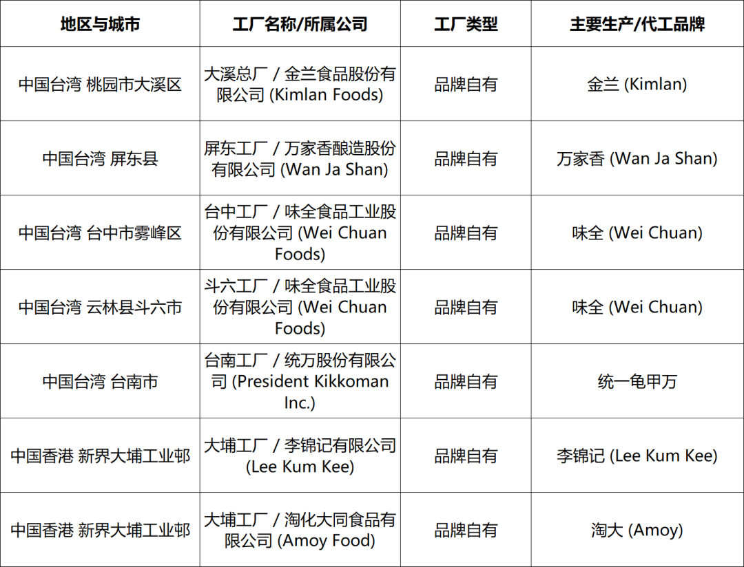 中国台湾与香港地区主要工业化酱油生产工厂名录