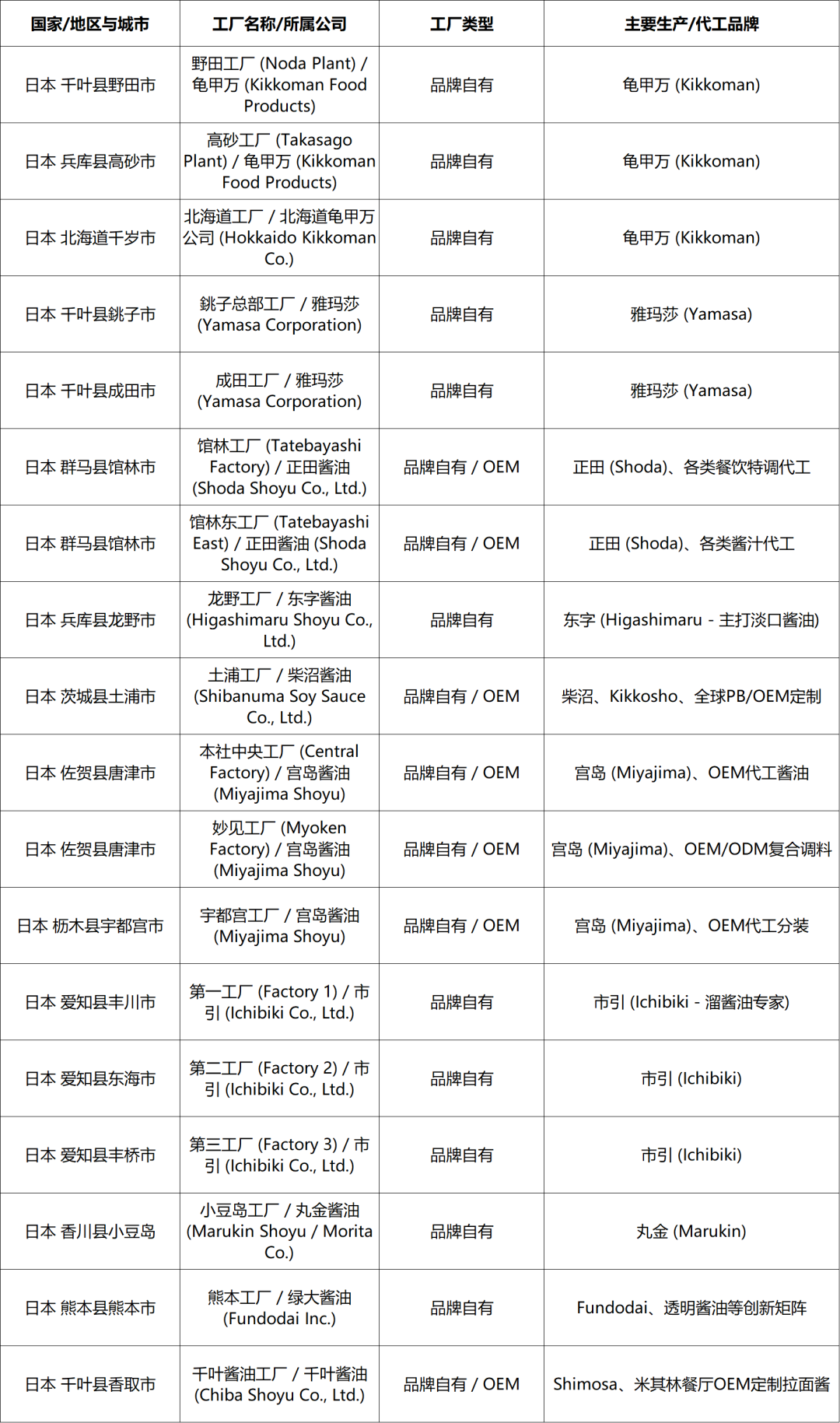 日本主要工业化酱油生产工厂名录