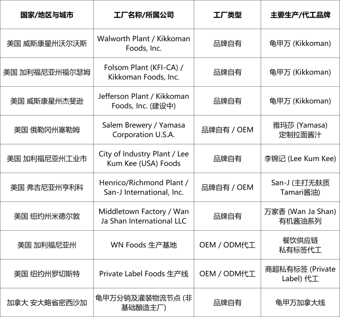 北美主要工业化酱油生产工厂名录