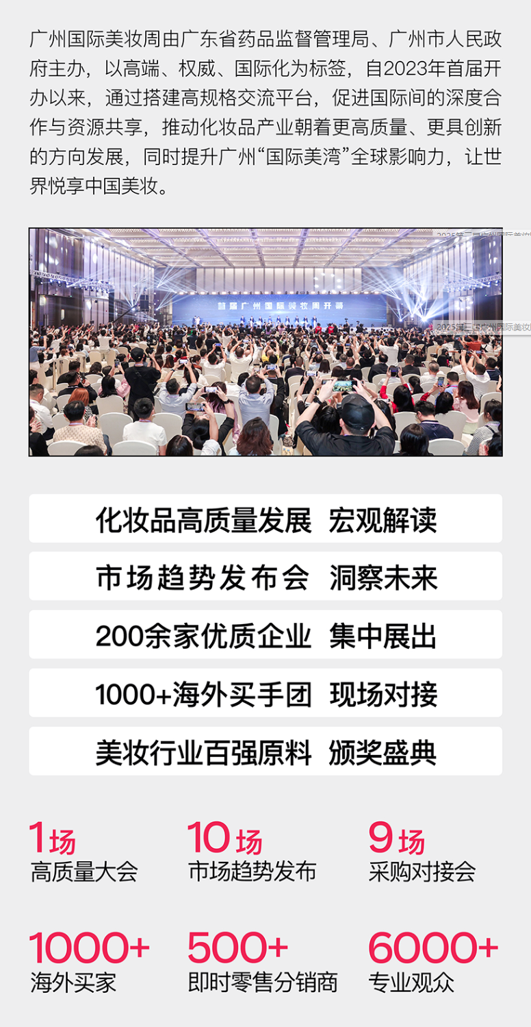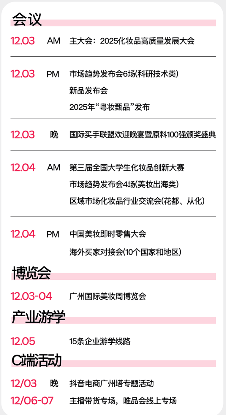 其中重点活动“2025中国(广州)化妆品进出口博览会”将于12月3-4日举行,定位为“美妆广交会”,汇聚全球产业链资源,打造集商贸对接、趋势洞察与战略合作为一体的高端行业平台。