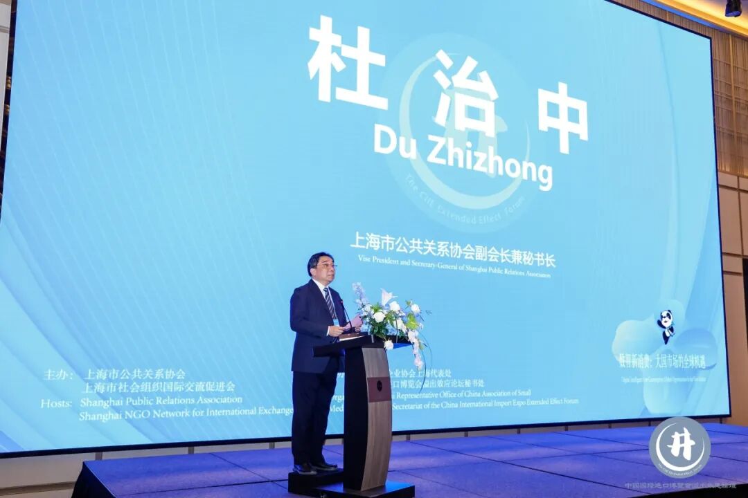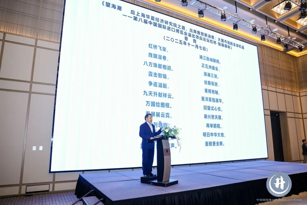 2025年11月7日,第八届中国国际进口博览会溢出效应论坛在上海虹桥成功举办。论坛以“数智新消费:大国市场的全球机遇”为主题,作为进博会上海会议活动的重要内容,由上海市公共关系协会和华夏经济发展研究院主办,上海社会组织国际交流促进会等单位支持,复旦大学国际金融学院智库中心主任/华夏经济发展研究院执行院长李清娟介绍了与会嘉宾:上海市公共关系协会会长/中共上海市委原常委统战部长沙海林、美中贸易全国委员会中国区高级副会长范诺亚(Noah Fraser)、中国国际教育协会副会长/复旦大学原党委书记/一带一路及全球治理研究院院长焦扬、上海市商务委员会副主任刘敏、上海市友协一级巡视员/社会组织国际交流促进会会长景莹、虹桥国际中央商务区管委会副主任杨旭波、上海市公共关系协会常务副会长副会长/秘书长杜治中、副会长陈庆善、上海国际贸易促进委员会原会长杨建荣、上海工业经济联合会会长管维镛、四川省工业文化协会主席/省委省政府决策咨询委工业组组长蔡竞、上海市政协副秘书长、民进上海市委专职副主委杨蓉、中国中小企业协会上海创始会长裔玉乾等300余位嘉宾出席了论坛。