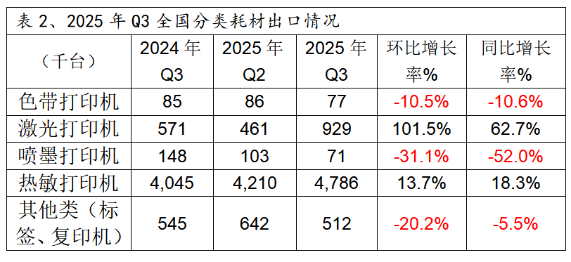、2025Q3全国分类打印设备出口数量: