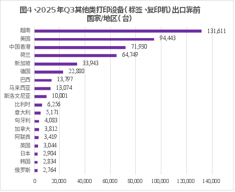 图4显示,2025Q3其他类打印设备标签、复印机)出口到越南的为13.2万台,占类打印设备总出口量的25.8%;排在第二到第五位的分别是美国9.4万台,中国香港7.2万台,荷兰6.5万台,新加坡3.4万台。