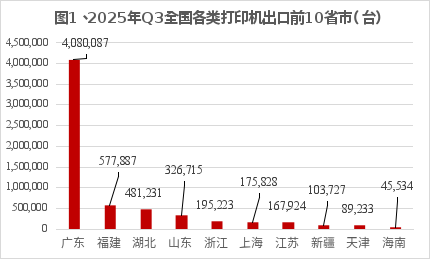 1看出,广东省在2025Q3出口打印设备408万台,占全国打印设备出口总量的64%;福建出口57.8万台,湖北出口48.1万台,分别排在第二和第三位。