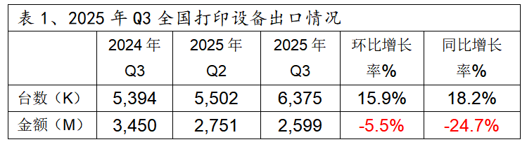 、2025年Q3全国打印设备出口整体情况