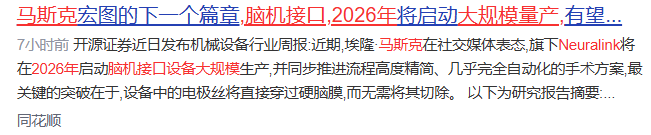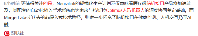 马斯克Neuralink官宣2026年脑机接口设备大规模量产,全球资本瞬间沸腾!更震撼的是,脑机接口将与Optimus人形机器人深度融合,大脑直接控制机器人 ,人机交互新范式即将颠覆世界!那些同时卡位“脑机+机器人”双赛道的企业,正迎来“双重风口+协同爆发”的史诗级机遇!今天按 2025三季报归母净利润同比增长从高到低 梳理核心公司,最高增速 331%!脑机接口关联 :子公司 岩思类脑研究院 研发 自主脑机接口系统 ,突破脑信号解码核心技术,为机器人提供“意念控制”底层支持;机器人关联 :旗下 岩芯数智 与某头部人形机器人公司合作,交付 搭载Yan大模型的智能机器人 (适配工业巡检、家庭服务场景);业绩亮点 :2025三季报归母净利润 同比暴增331.09% (断层第一),脑机+机器人双业务协同效应爆发,外资持股占比超15%!脑机接口关联 :控股子公司 香港佳纳 投资 强脑科技 (全球领先脑机接口企业),间接切入脑机电极、芯片核心环节;机器人关联 :大力推进 碳纳米管材料 在机器人关节、外壳的应用,与特斯拉Optimus、波士顿动力等领先机器人公司深度合作;业绩亮点 :2025三季报归母净利润 同比增长182.45% ,碳纳米管材料营收占比提升至35%,机器人订单锁定2026年产能!脑机接口关联 :联合华南理工大学成立 广州华南脑控智能科技 ,在上海建 人工智能与脑科学研究院 ,深度参与脑电解码算法研发;机器人关联 :发布 “大模型+具身智能”人形机器人技术原型 ,推出 机器人超脑平台 (适配工业、服务、教育机器人);业绩亮点 :2025三季报归母净利润 同比增长80.6% ,机器人超脑平台订单同比增240%,医疗康复场景落地30+三甲医院!脑机接口关联 :与神舞科技联合发布 脑机接口远程控制系统 ,实现 200公里外脑控机器人 (误差率<0.1%);机器人关联 : BlackEye Vision机器人系统 适配工业机械臂、人形机器人,支持高精度抓取、复杂环境巡检;业绩亮点 :2025三季报归母净利润 同比增长68.84% ,军方脑控机器人订单锁定2026年营收,毛利率超75%!脑机接口关联 : LCP薄膜产品 与海外公司共同开发验证,用于脑机接口柔性电路(替代日本村田方案,成本降50%);机器人关联 : PEEK材料 批量用于工业机器人关节、齿轮,耐磨性提升40%,已进入埃斯顿供应链;业绩亮点 :2025三季报归母净利润 同比增长55.42% ,LCP薄膜通过Neuralink初步验证,2026年批量供货预期强烈!脑机接口关联 :参与上海“科技创新行动计划”脑机接口项目,提供 算力集群+存储解决方案 (支持每秒亿级信号处理);机器人关联 :联合客户开发 宠物陪伴机器人、自变量机器人 (搭载情感交互算法,C端预售破万台);业绩亮点 :2025三季报归母净利润 同比增长49.53% ,脑机算力业务营收占比达28%,宠物机器人出货量同比增120%!脑机接口关联 :持股 傲意科技20.41% (国内领先机器人与脑机接口企业,外骨骼机器人市占率第一);机器人关联 :具备 人形机器人执行机构总成、行星滚柱丝杠 核心部件开发能力(国产化率超70%,适配特斯拉Optimus二代);业绩亮点 :2025三季报归母净利润 同比增长48.02% ,特斯拉订单占比超40%,行星滚柱丝杠产能扩张至10万套/年!脑机接口关联 :与麦澜德签署战略合作, 聚焦脑机接口与机器人融合 ,探索智能康养场景(脑控护理机器人);机器人关联 :开发 轮式、挂轨、轮足等多形态机器人 ,人形机器人原型机完成步态调试(负载50kg,续航8小时);业绩亮点 :2025三季报归母净利润 同比增长47.26% ,康养机器人订单超5000台,江苏、浙江养老院覆盖率第一!脑机接口关联 : 首创无创脑电采集设备 ,整合脑电采集与康复机器人,实现“意念-动作”闭环训练;机器人关联 :聚焦 运动康复机器人 ,构建上下肢、全周期康复产品矩阵(适配中风、脊髓损伤患者);业绩亮点 :2025三季报归母净利润 同比增长30.68% ,康复机器人营收占比达45%,华山医院等顶级机构复购率超80%!脑机接口关联 :全资子公司 九州通医疗器械集团 为湖北省人民医院供应 脑机接口康复训练系统 (单台售价超200万元);机器人关联 :旗下物流科技公司打造 覆盖全流程的智能物流机器人矩阵 (分拣、搬运、冷链运输,市占率超30%);业绩亮点 :2025三季报归母净利润 同比增长16.46% ,智慧医疗业务增速超100%,物流机器人落地100+仓储中心!诚心推荐一个我私藏的宝藏号:【报点金】