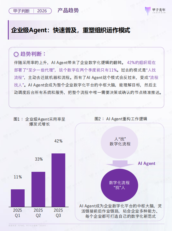 产品趋势聚焦三大方向:Agent 泛化采用 “改造车适应路” 的逻辑,通过强化学习提升感知、策略与行为泛化能力;企业级 Agent 快速普及,采用率从 2025 年 Q1 的 11% 跃升至 Q3 的 42%,重构 “流程找人” 的组织运作模式;消费级 Agent 中通用人工智能助手占主导,91% 的用户优先使用偏好的通用工具,相关支出占全球消费级 AI 总支出的 81%,同时 AI 交互正从聊天框向 “无形代理” 演进,界面逐步隐形。