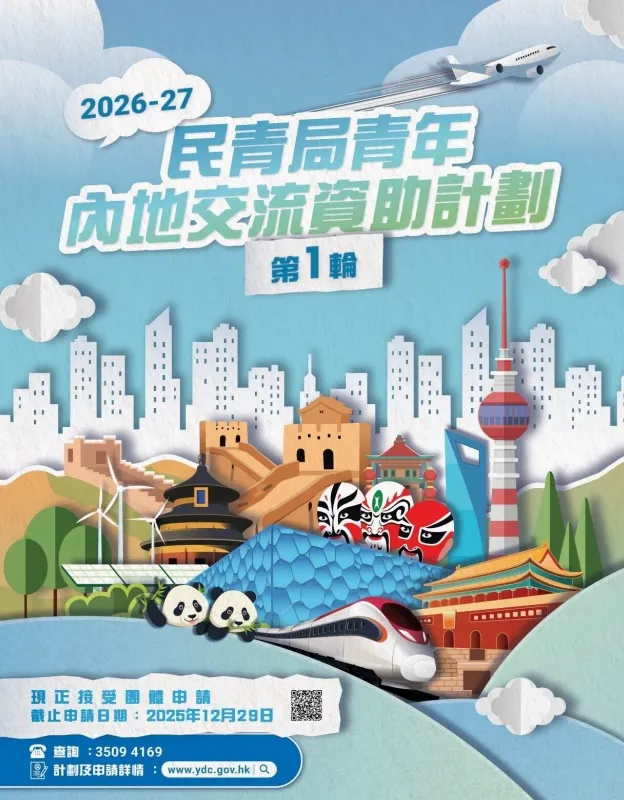 民政及青年事务局联同青年发展委员会11月17日推出2026至27年度民青局青年内地交流资助计划(第一轮),邀请合资格非政府机构提交申请。