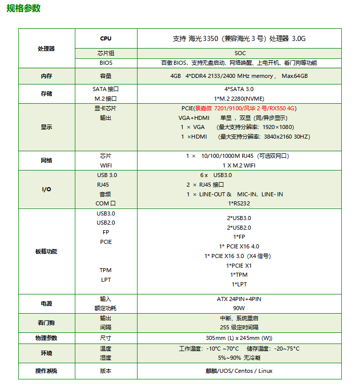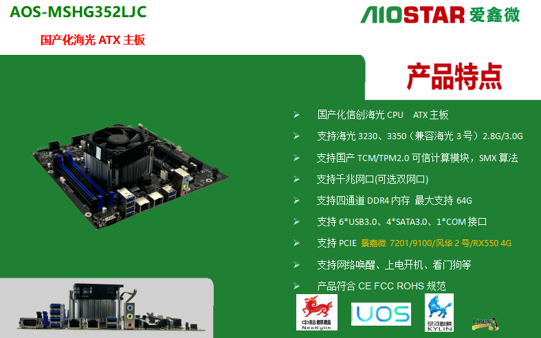 国产海光HG-3230/HG-3350,兆芯 KX-6640A/KX-6640MA/KX-6580/KX-U6780A,飞腾 FT-2000/FT-D-2000国产操作系统(UOS/Deepin/Kylin),还可以支持国产显卡(景嘉微7201/芯动A4/芯动A6 2~4G可选 )