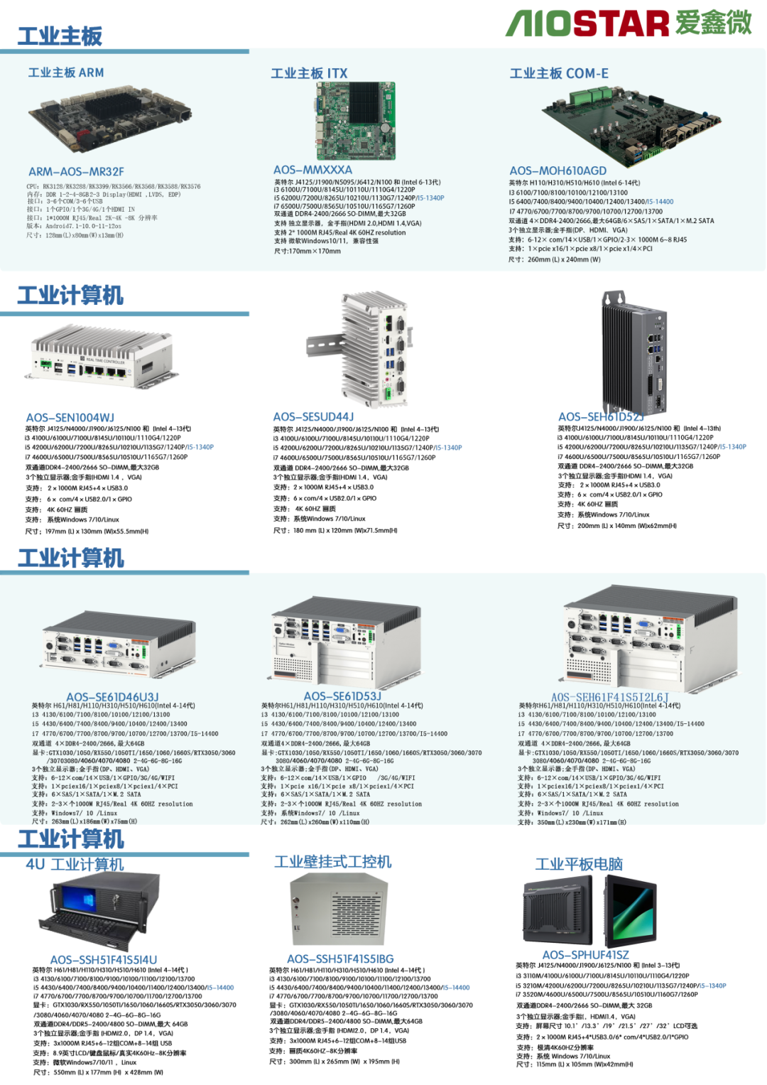 爱鑫微电子作为国内工业产品及工控机领域产品线最全的研发、生产、销售为一体的厂家,同时提供OEM/ODM定制服务,目前主产品线为: