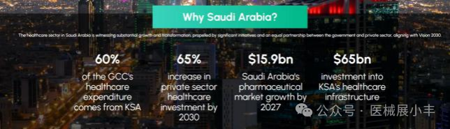 沙特作为中东三大医疗器械市场之一,为生物医药、医疗器械行业创造了新机。由于人口数量的大幅增加,人均收入增长,医疗保健随之支出增加。60% GCC成员国的医疗保健支出中有很大一部分来自沙特阿拉伯,且到2023年私立医院的医保投资将会有65%的增长,到2027年沙特阿拉伯医药市场将增长159亿美元