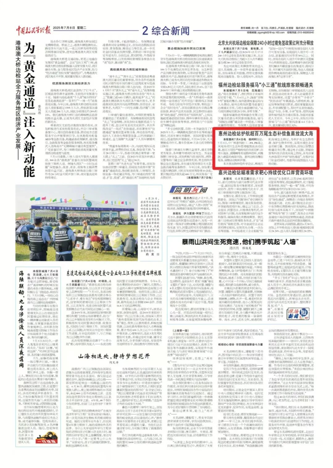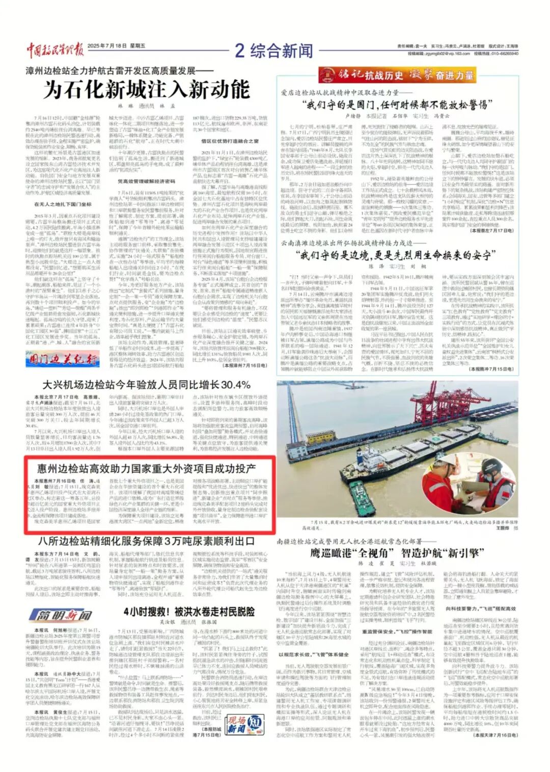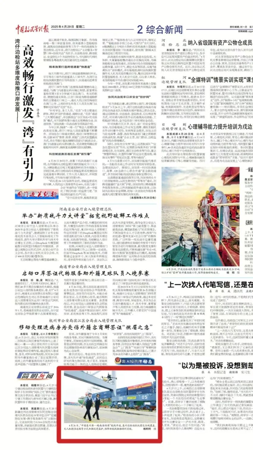 围绕迎战台风 “桦加沙” ,全力护航海港口岸人员、船舶及设施安全稳定,相关抗台防汛亮点工作与实战成效,被中央广播电视总台新闻频道、中国移民管理报头版刊发。