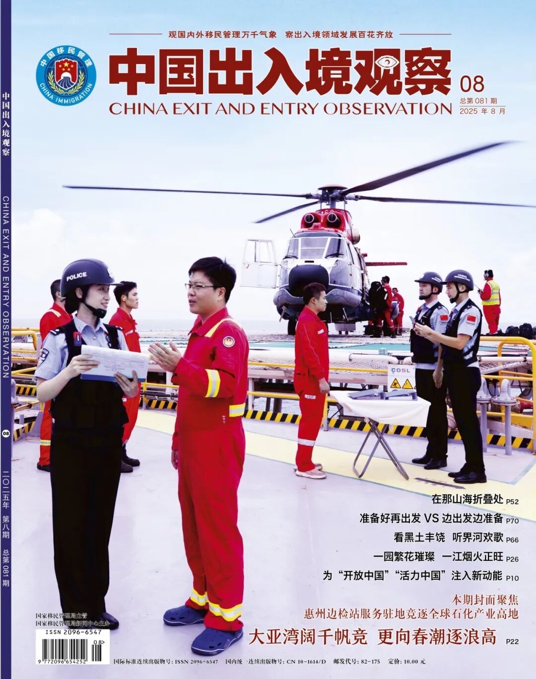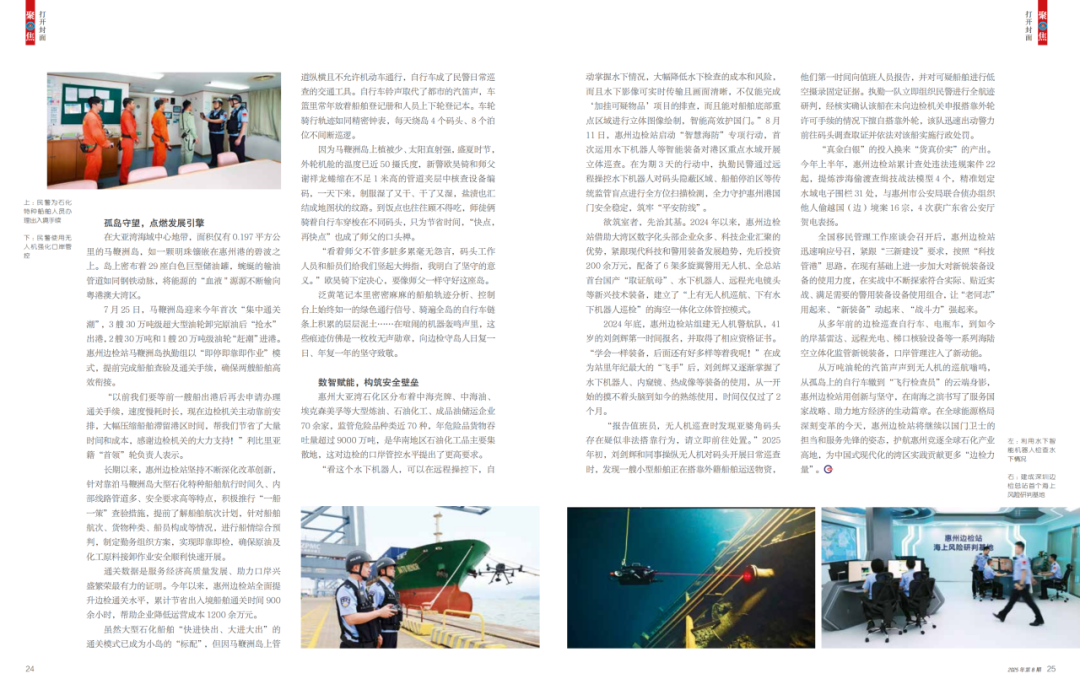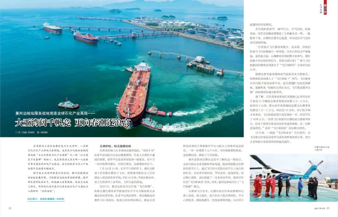 聚焦通关保障创新突破与科技应用深度赋能,撰写《惠州边检站服务驻地竞逐全球石化产业高地——大亚湾阔千帆竞 更向春潮逐浪高》通讯文章,被《中国出入境观察》8月刊专题刊发,飞行执勤图片荣登杂志封面