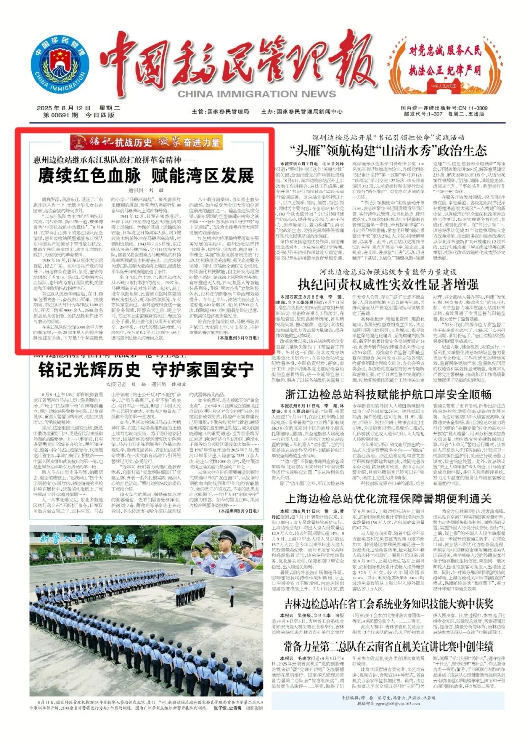 深挖口岸红色历史根脉,紧扣革命精神传承与时代使命担当,撰写《惠州边检站继承东江纵队敢打敢拼革命精神——赓续红色血脉 赋能湾区发展》,被中国移民管理报头版头条刊发。