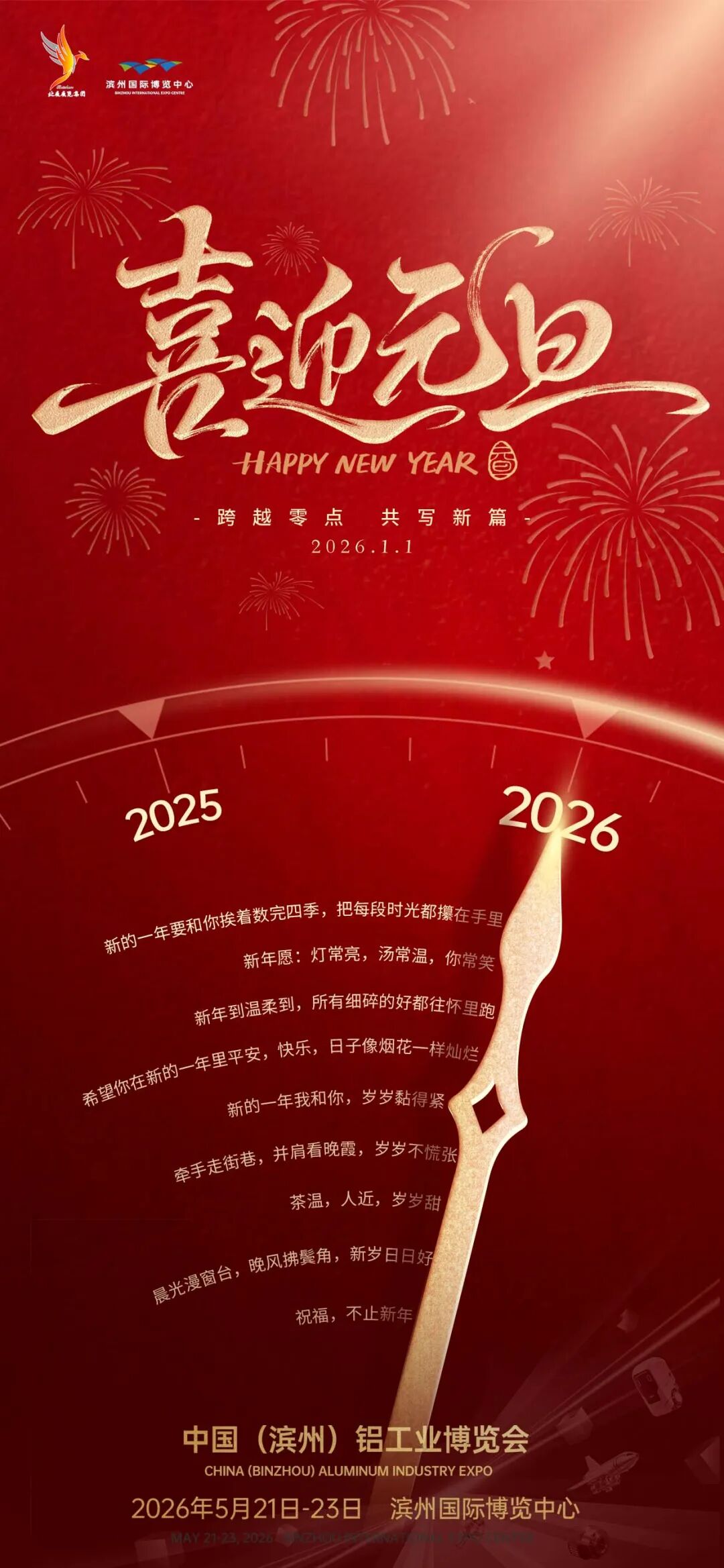值此元旦新岁来临之际,2026 滨州铝工业博览会组委会谨向全体铝行业同仁致以最诚挚的节日祝福,恭祝大家元旦顺遂、事业兴旺!作为 “中国铝业铝谷” 的年度产业盛会,明年的滨州铝博会将以 “铝谷逢新岁,智造启华章” 为愿景,汇聚全产业链铝业创新资源,聚焦高端化、绿色化、智能化发展方向,搭建行业技术交流、成果转化与合作共赢的核心平台。