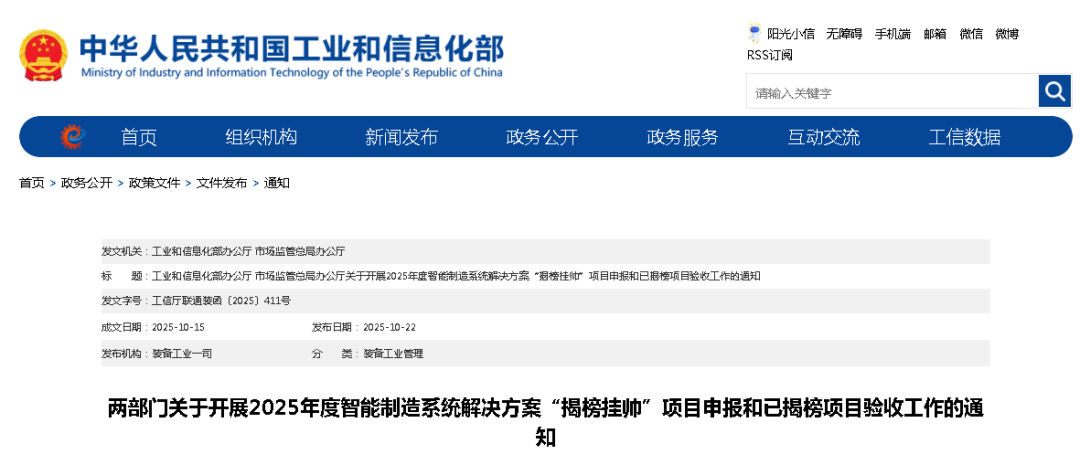 为贯彻落实国务院办公厅印发的《制造业数字化转型行动方案》,按照《“十四五”智能制造发展规划》任务部署,构建智能工厂、解决方案、标准体系“三位一体”工作体系,打造智能制造“升级版”,工业和信息化部、市场监管总局联合开展2025年度智能制造系统解决方案“揭榜挂帅”项目申报和已揭榜项目验收工作。现将有关事项通知如下: