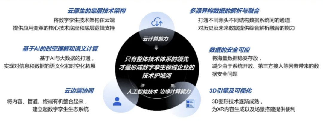 数字孪生技术是具有高复杂性的架构体系,其核心技术能力包括云原生的底层技术架构、多源异构数据的解析与融合、基于 AI 的时空理解和语义计算、数据安全可控、云边端协同、3D引擎及可视化等诸多技术能力。