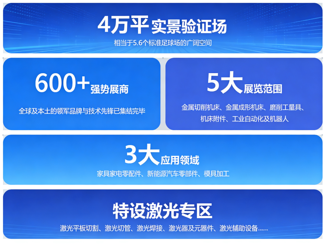 五大展览类别 - 包括金属切削机床、金属成形机床、磨削工量具、机床附件以及工业自动化和机器人,全面覆盖从加工到成型、测量、辅助直至自动化的整个制造链条,为观众提供从单一机器到整套生产线的全方位解决方案。