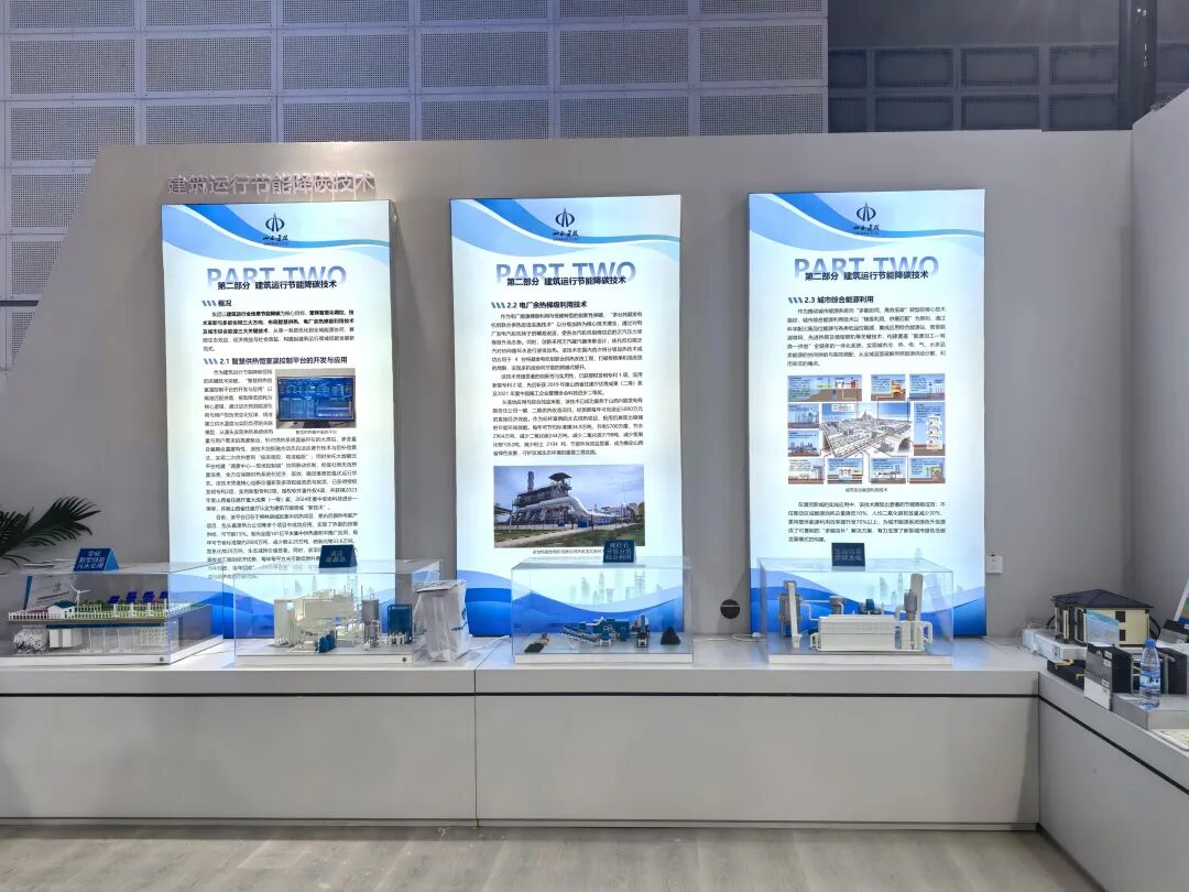 建筑运行节能降碳技术展区,展现了地源热泵系统、多台纯凝发电机组联合供热等清洁供热技术。