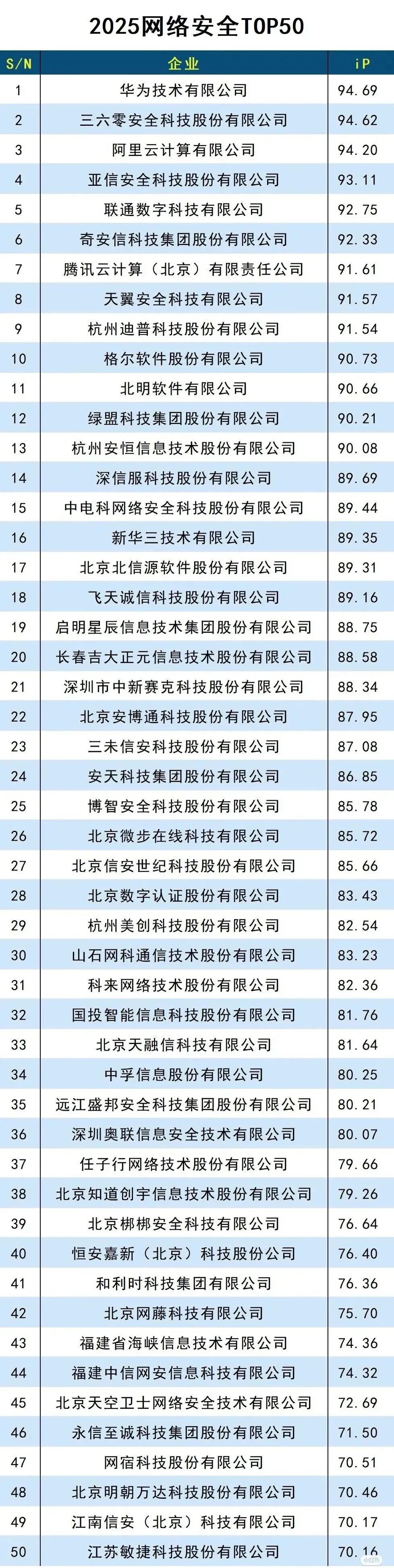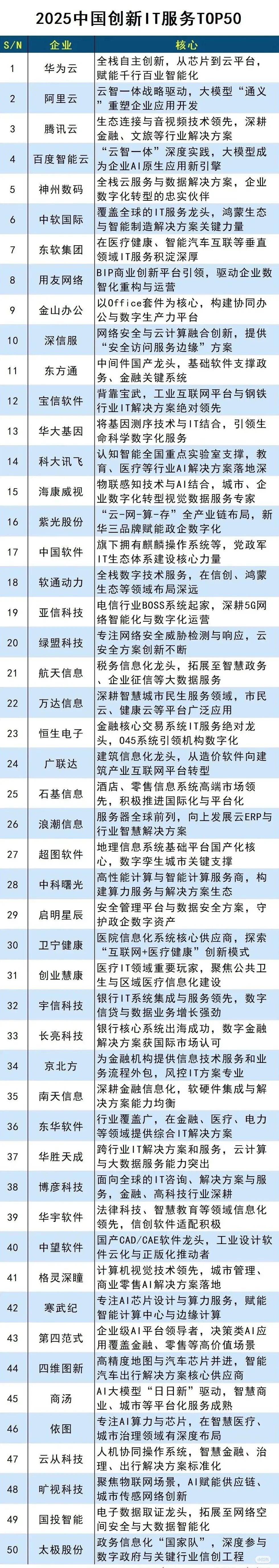 网络安全TOP50榜单中,华为技术以94.69分居首,三六零、阿里云位列二三。随着数字化进程加速,网络安全已成为关键基础设施。上榜企业覆盖威胁检测、数据加密、云安全等细分领域,呈现出“全栈能力+专业深耕”的双重特征。在信创政策推动下,国内安全企业迎来黄金发展期。IT服务:数字化转型助推器