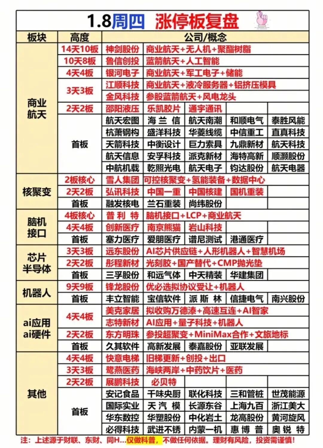 1月8日A股市场,科技板块表现活跃。商业航天、脑机接口、可控核聚变等前沿概念涨幅居前,反映出投资者对硬科技赛道的高度认可。金风科技因参股蓝箭航天连续涨停,脑机接口、半导体等概念股集体走强。主力资金流向显示,科技板块成为资金配置重点。科技创新综合榜:华为、阿里领跑硬核赛道
