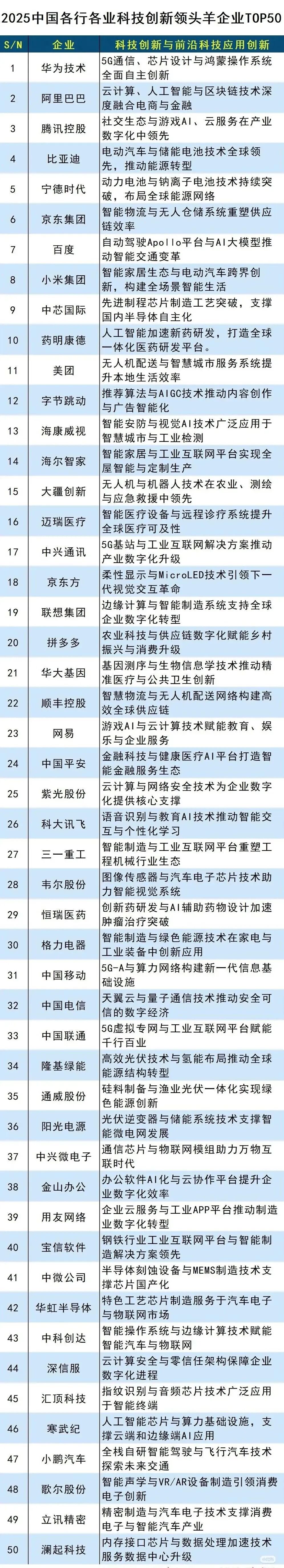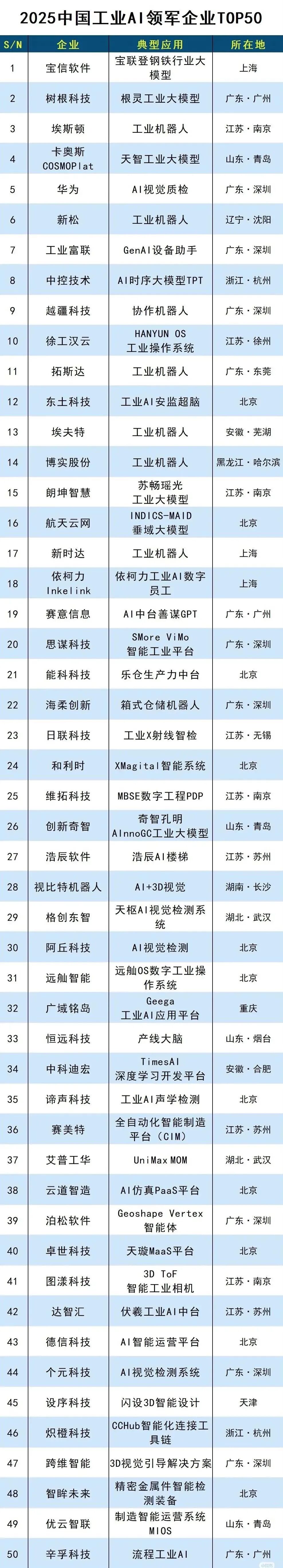 2025中国科创领头羊TOP50榜单显示,华为、阿里巴巴、腾讯等巨头持续领跑,在5G通信、云计算、人工智能等前沿领域深度布局。半导体、新能源、AI等硬核赛道成为创新主战场。比亚迪、宁德时代在新能源领域表现突出,中芯国际在芯片制造环节突破显著。创新正从消费互联网向产业互联网深化,工业场景成为新焦点。工业AI:智能制造核心引擎