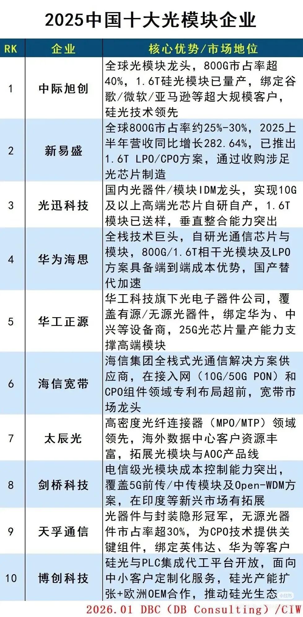 光模块赛道迎来洗牌,中际旭创、新易盛在800G高端市场占据主导地位,华为海思凭借全栈技术紧追不舍。1.6T硅光模块已进入量产阶段,CPO、LPO等新技术加速落地。随着AI算力需求爆发,光通信产业迎来新一轮增长周期。风险提示:以上内容基于公开资料整理,仅供参考,不构成投资建议。市场有风险,决策需谨慎。