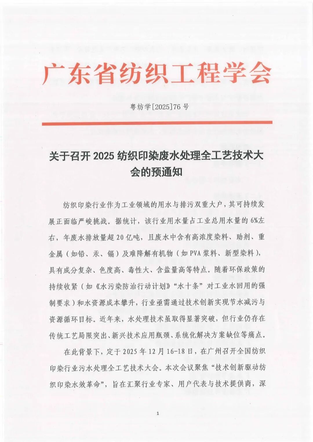 在此背景下,定于2025年12月16-18日,在广州召开全国纺织印染行业污水处理全工艺技术大会。本次会议聚焦“技术创新驱动纺织印染水效革命”,旨在汇聚行业专家、用户代表与技术提供商,深度探讨。源头减排:无盐染色、无水印染工艺的产业化路径;深度处理:膜集成工艺、高级氧化及智能药剂的效能优化;资源回用:重金属回收、中水回用率提升(目标90%+)的技术经济模型;政策适配:双碳目标下节水技术推广的激励机制与标准建设。