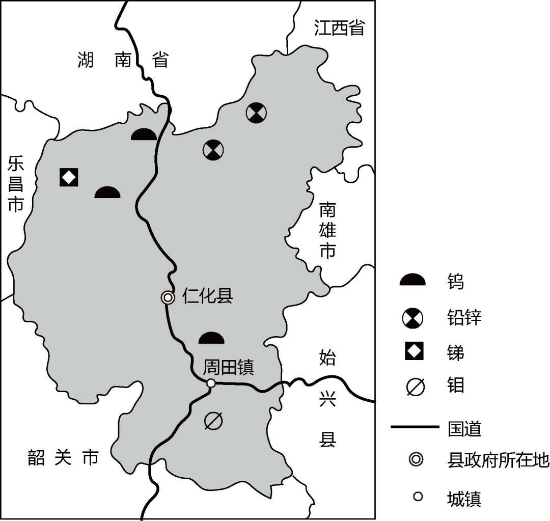 仁化县位于广东省北部,地处南岭山脉南麓,是中国“有色金属之乡”。位于仁化县周田镇的仁化产业转移工业园于2009年筹建,如今已初步形成以有色金属深加工、储能、新能源电池材料为主导产业的发展格局。下图为仁化县有色金属矿产分布及周田镇位置图。据此完成下面小题。