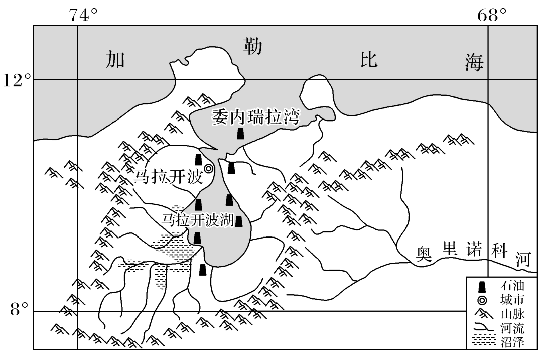 马拉开波盆地位于委内瑞拉西北部,四周山地环绕,盆地中心是南美洲最为湿热的马拉开波湖湖区。湖区大部分高温多雨,年平均降水量1500毫米以上。湖区有7000多口油井,炼油工业发达,湖区周边城市因此迅速发展。马拉开波湖原本仅通过一条狭窄的水道同加勒比海连接,湖水北咸南淡。为了发展湖内的采油业,50多年前人们开始将连接外海的水道拓宽、挖深。下图为马拉开波湖简图