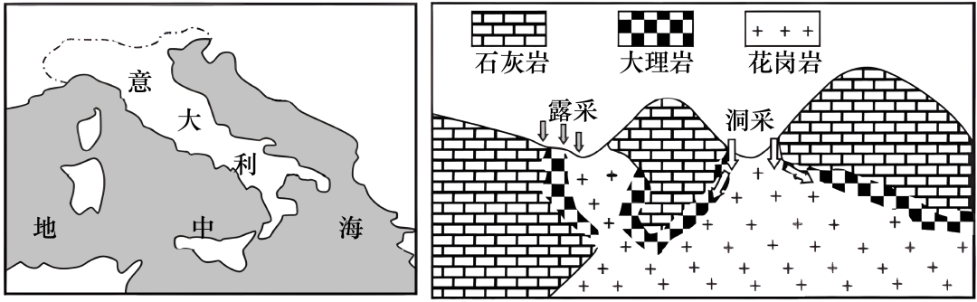 地中海沿岸国家盛产大理石,大理石主要由古地中海中沉积的石灰岩变质而形成。意大利有大理石王国之称,大理石资源丰富、质地优良、分布广泛,开采历史悠久,开采加工技术先进,出口量约占国际市场总贸易量的一半。大理石开采主要有露采(露天开采)和洞采(循着矿脉挖洞追踪开采)两种方式。与露采相比,洞采综合开采成本较低,且对地表植被破坏较少,但仍有很多地区不采取洞采。如图为意大利地理位置和大理石分布以及开采示意图。