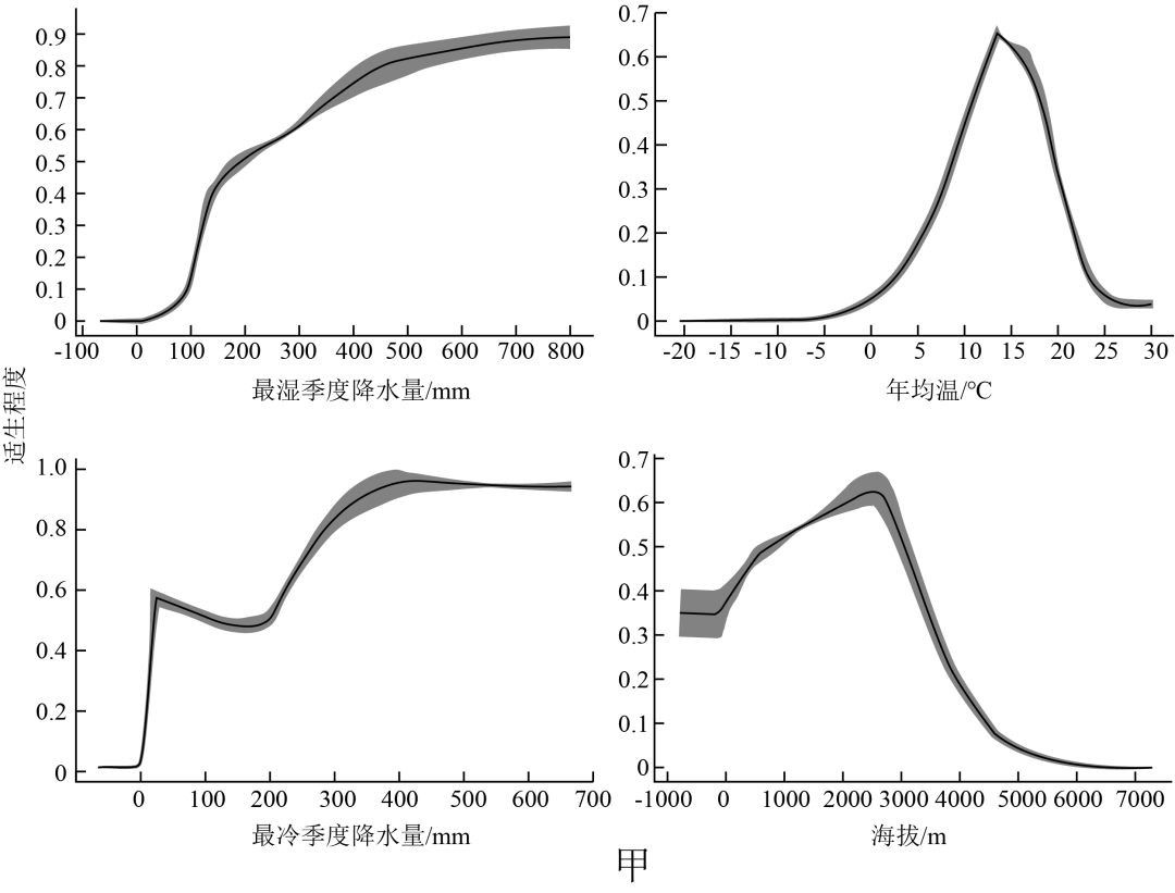 软枣猕猴桃在中国从最北的黑龙江岸至南方广西境内的五岭山地都有分布,下图中甲图为软枣猕猴在4个环境因子(最湿季度降水量、年均温、最冷季度降水量和海拔)中的适生程度(在特定环境条件下生物能够良好生存和繁衍的能力);乙图为软枣猕猴桃示意图,据此完成下面小题。