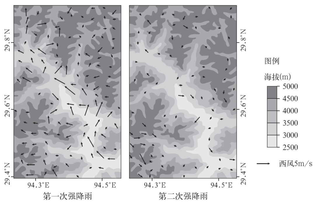 2019年9月17—18日西藏林芝地区出现了两次强降雨。研究表明,深入谷地的季风为该地降雨提供了充足的水汽,山谷风影响了降雨的时空变化,使降雨呈现明显的时段特征。如图示意两次强降雨时距地面10米处的风向与风速。据此完成下面小题。
