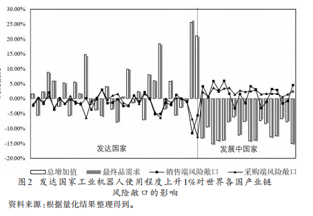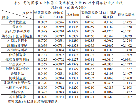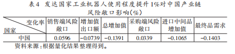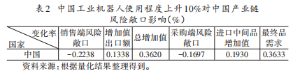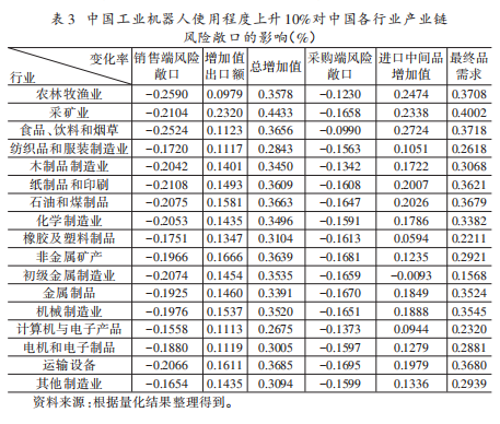 为检验中国工业机器人应用对自身产业链风险敞口的作用,本文模拟了中国工业机器人使用程度提升10%的场景,结果呈现于表2。该表显示,当中国工业机器人使用程度提升10%时,产业链销售端风险敞口下降0.2238%,采购端风险敞口下降0.1697%,且增加值出口额、进口中间品增加值分别增长0.1338%、0.1930%,总增加值、最终品需求则分别增长0.3620%、0.3633%。这一结果的核心经济含义是:中国工业机器人使用程度的提升并非通过“经济内向化”降低产业链风险敞口,而是通过提升生产效率、降低生产成本,推动总增加值和最终品需求的更快增长,进而降低了增加值对外部市场、最终品生产对外部中间品的依赖程度,最终实现风险敞口的下降,这也印证了本文的核心理论机制。